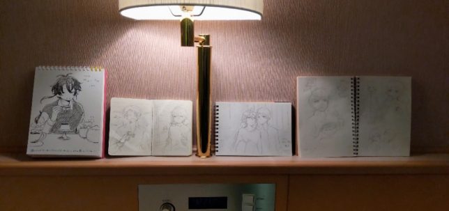 お互いスケブとかメモ帳とか落書き帳にいっぱいお絵かきしたので、ホテルのベッドのヘッドボードに並べて「あくはる美術館~」とか言って遊んでました。