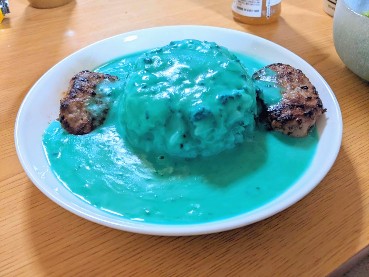富士山カレー貰ったから食べたけど色がヤバかった。ターコイズブルーっていうんですかね。全然食欲がわかない色だ…。ハンバーグ入れたんだけど油と混ざった部分が緑色になるのも最悪でした!味はなかなかよかったですよ。ココナッツ味。おいしいんだけどね…なかなか進まなくて食べきるのに時間がかかりましたね…。見た目って大事だな。