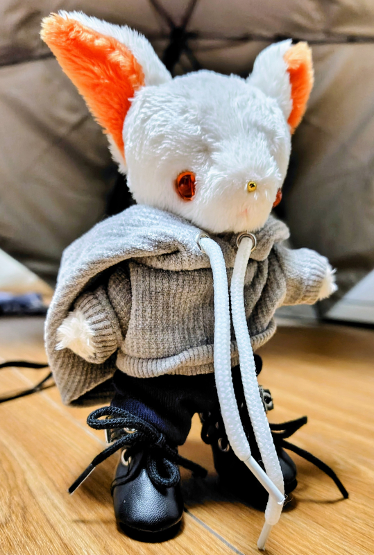 スリーコインズの服着せたらこうなる。ちょっと手足が太いがなんとか着れる!靴履けば自立できます。